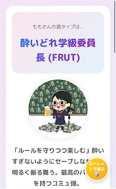 こんにちわ!ももです!🍑💗 また新たに診断系見つけて そういうの好きな私は 試しにやってみたよ😃😃笑 お酒の場に関しての質問に何個か答えると 自分がどのタイプに当てはまるのか 特徴とか教えてくれるやつ😊 わたしはこれだった🍑 がががが 学級委員長!?!!?!?🫨🫨 わたし学生の時からそういうのは嫌いだった⚡️笑 最高のバランスの持ち主らしい😚😚 いい事しか書いてない めちゃくちゃ褒められててバランス良き😙😙 お酒もセーブ出来て適度に飲めて 周りに気遣いも出来る コミュ強女子ってことでいい??💓😮 人を盛り上げるの得意ではないけど やっぱり誰かと一緒に飲むお酒は好きだし せっかくそういう場が開催されてるなら 自分も含め、みんなにも楽しんでもらいたい☺️ お店に来てくれるお客様一人一人も いつどこで誰と出会えるかなんて その時しか分からないことだから せっかく話して飲んで出来る場所だからこそ 一緒に楽しく盛り上がりたい🙌🏻🙌🏻✨️✨️✨️ あ〜ルグラン楽しかったな ももちゃん楽しかったな😊 出会えた人話せた人に なるべくそうやって思ってもらって 楽しい気持ちのままその場を終えたいなっっ🥺🥺 診断系めっちゃおもしろーーい🤍🤍 また面白そうなのあったらやって みんなにも紹介するねᴗ ̫ ᴗ✨️ 今日も出勤です💗💗💗 土曜日の夜一緒に楽しみましょ💖💖